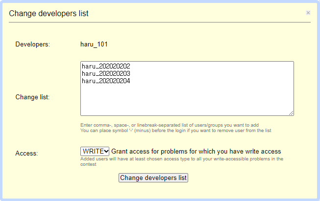 Change list에서 한줄마다 "출제/검수진" 분들의 "polygon" ID를 입력해주세요. 그런다음 Access를 WRITE로 설정한 후, 아래의 Change developers list를 눌러줍시다.