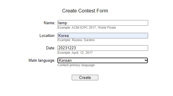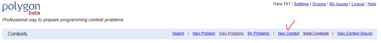 회원가입 후, New Contest에 들어가서 Contest를 하나 만들어줍시다. (문제 폴더를 하나 만든다는 개념으로 이해해주세요.)