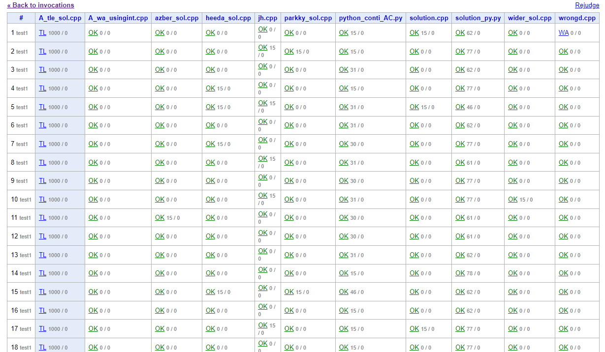 Innovacation을 실행한 후 나오는 결과입니다. TL이나 OK 옆에 뜨는 X / Y는 시간을 X ms, 메모리를 Y MB 소모했다는 뜻입니다.