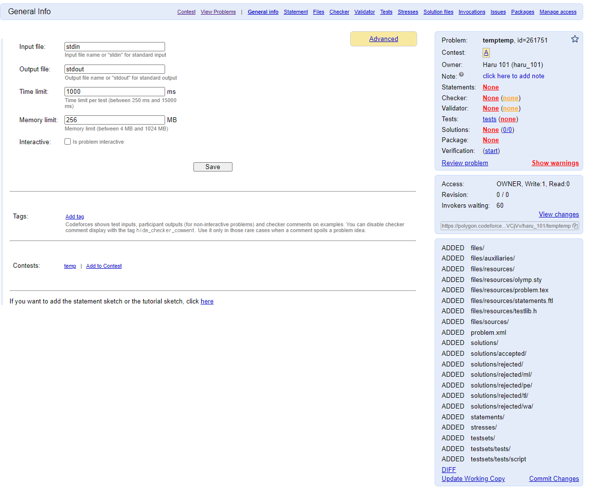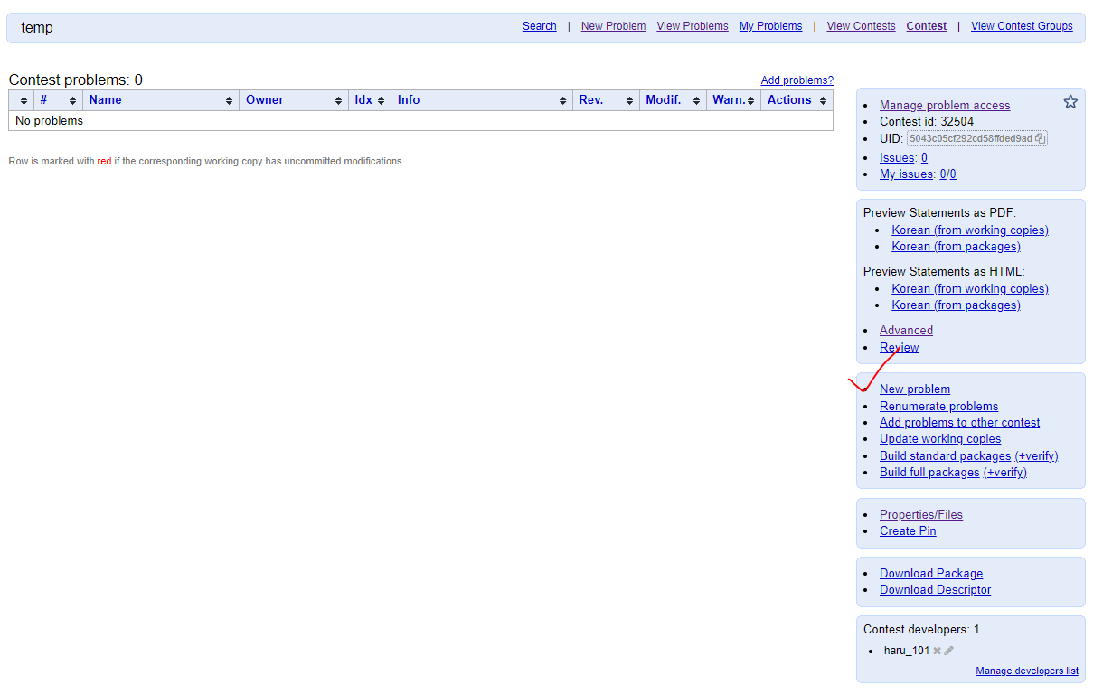 이제 다시 자신이 만든 Contest에 들어가면 입력한 이름으로 된 문제가 하나 생기게 됩니다.