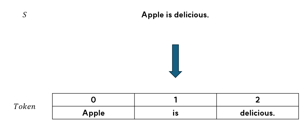 예를 들어 $S$가 'Apple is delicious.'이라면 토큰은 Apple, is, delicious.(온점 포함)이 됩니다.
