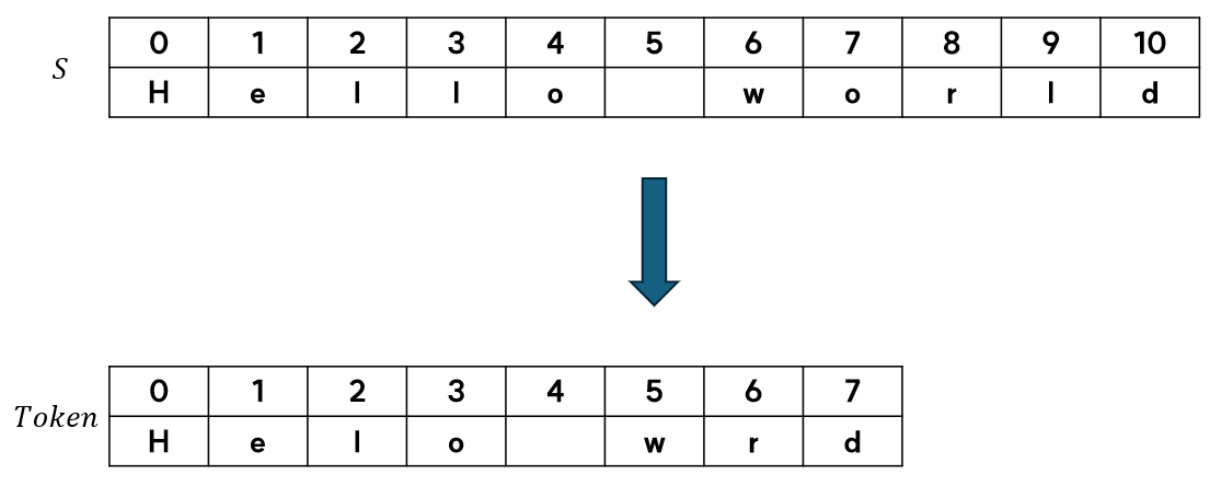 문자 토큰화는 문자열 $S$에 있는 각 문자 $S_i$를 토큰으로 사용하는 토큰화 방법입니다.